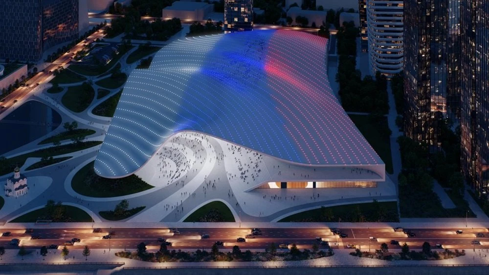 The concept has been developed by the ATRIUM architectural bureau in collaboration with the National Centre RUSSIA. The shape of the roof is based on the image of a protective veil covering the country with care. This symbol evokes a snow blanket over fields, a maternal shawl, and the tradition of spiritual protection. The architects aimed to convey lightness, dynamism and openness — creating not a heavy monument, but a space that draws people in and invites them to stay. The façade and roof will become a multimedia surface, with lighting and graphics changing depending on the season and ongoing events.
