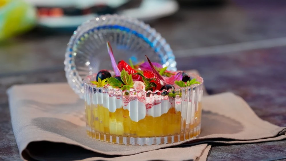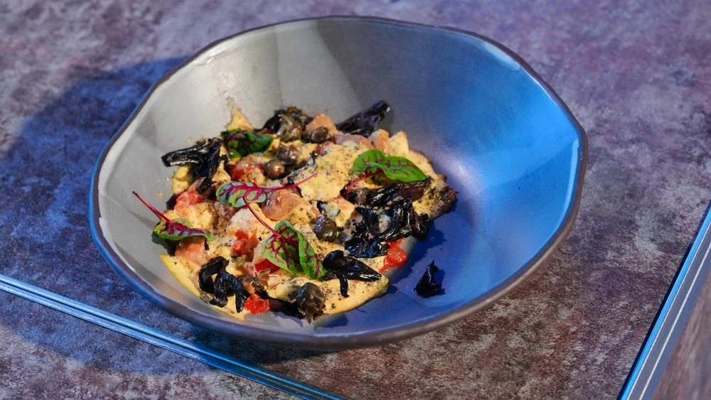 The hot dish featured rapana sea snails with black chanterelles, tomatoes, red onion, and a cheese cream with pickled dandelions. Kolodyazhny prepared the rapana using the sous-vide method at a low temperature to preserve their tender texture, while the black chanterelles were first dried and then sautéed to intensify their flavour.