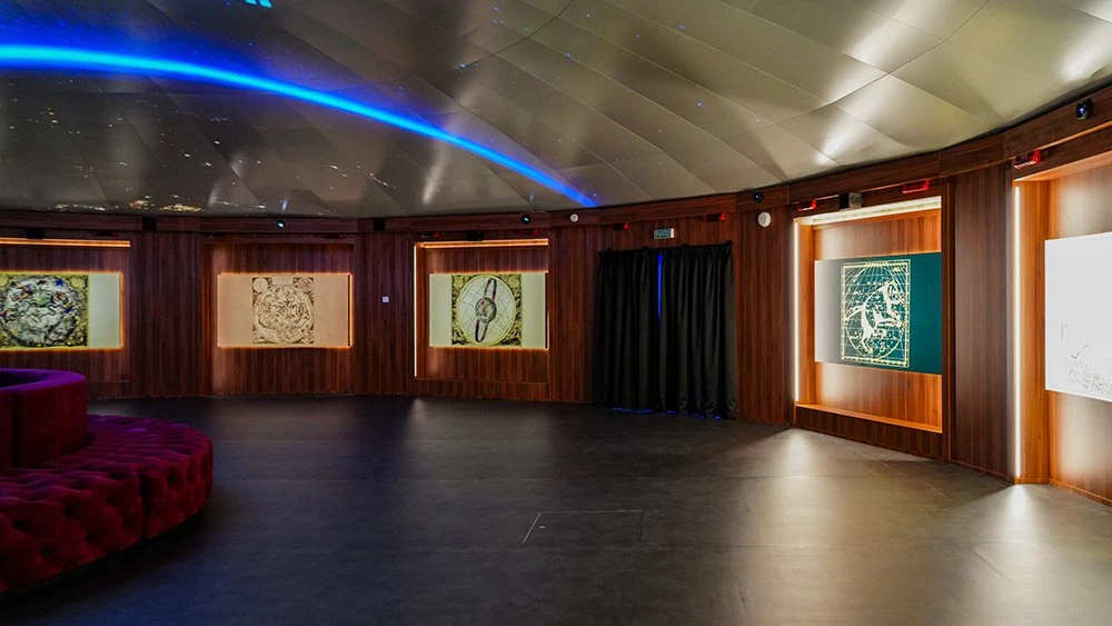 Soft lighting and a large dome-shaped screen create a special atmosphere, turning the space into an immersive planetarium. Visitors can sit comfortably on a circular sofa and observe the starry sky and satellite trajectories.